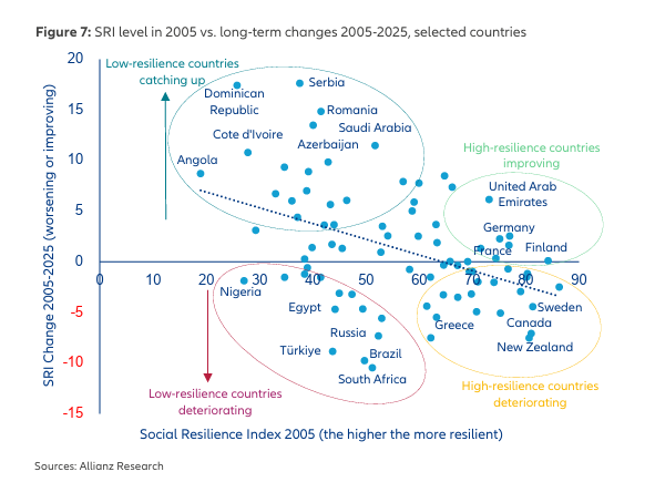 O Brasil apresentou um dos desempenhos mais preocupantes no Índice de Resiliência Social (SRI) 2025, realizado pelo time de economistas da Allianz Research, divisão de pesquisa macroeconômica da Allianz Trade, líder mundial em seguro de crédito. De acordo com o relatório Allianz Social Resilience Index 2025: The Middle-Resilience Trap, divulgado nesta semana, o país sofreu a pior deterioração das 171 economias analisadas, caindo 8,7 pontos e 41 posições no ranking global em apenas um ano, passando do 71º para o 112º lugar.