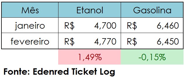 Em fevereiro, o preço médio da gasolina nos postos de todo o Brasil registrou leve redução de 0,15% em comparação com janeiro, chegando a R$ 6,45. O preço médio do etanol, por outro lado, avançou no período, com aumento de 1,49%, sendo comercializado a preço médio de R$ 4,77. Os dados são da mais recente análise do Índice de Preços Edenred Ticket Log (IPTL), levantamento que consolida o comportamento de preços das transações realizadas nos postos de combustível em todo o País, garantindo uma média precisa.
