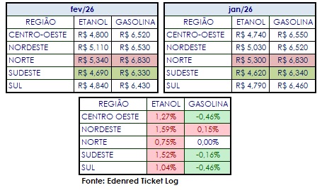 Na análise por regiões, todas registraram aumento para etanol em fevereiro. A mais alta foi registrada no Nordeste, de 1,59%, fazendo com que o biocombustível fosse comercializado por, em média, R$ 5,11. O Norte segue com o etanol mais caro, com preço médio de R$ 5,34 (+0,75%). Já o etanol mais competitivo foi o da região Sudeste, com média de R$ 4,69 (+1,52%).