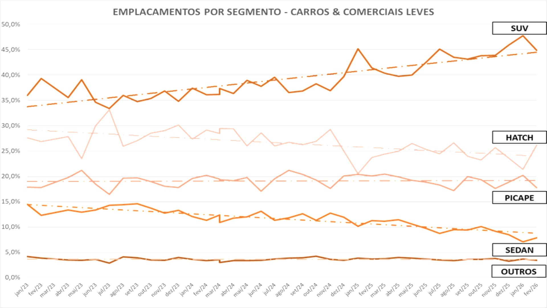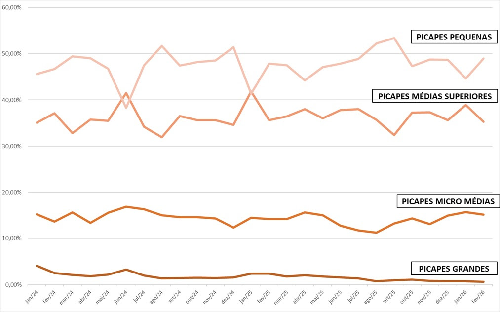 Segundo dados da K.LUME Consultoria, as picapes encerraram 2025 com 485.968 unidades, equivalente a 19,08% dos veículos emplacados no ano. No acumulado até fevereiro de 2026, o segmento fica dentro da variação normal observada mês a mês, com 18,92% de participação do mercado.