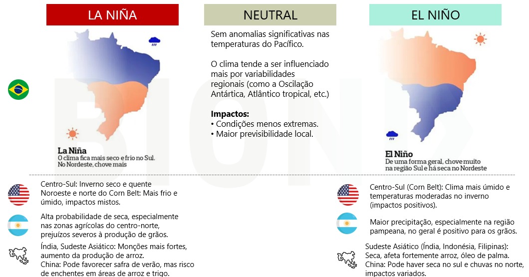 Modelos do CPC/NOAA indicam cerca de 55% de probabilidade de transição para neutralidade entre janeiro e março de 2026, o que significa que os efeitos mais expressivos devem ocorrer entre dezembro e fevereiro, período crítico para o desenvolvimento de lavouras de soja, milho e algodão.