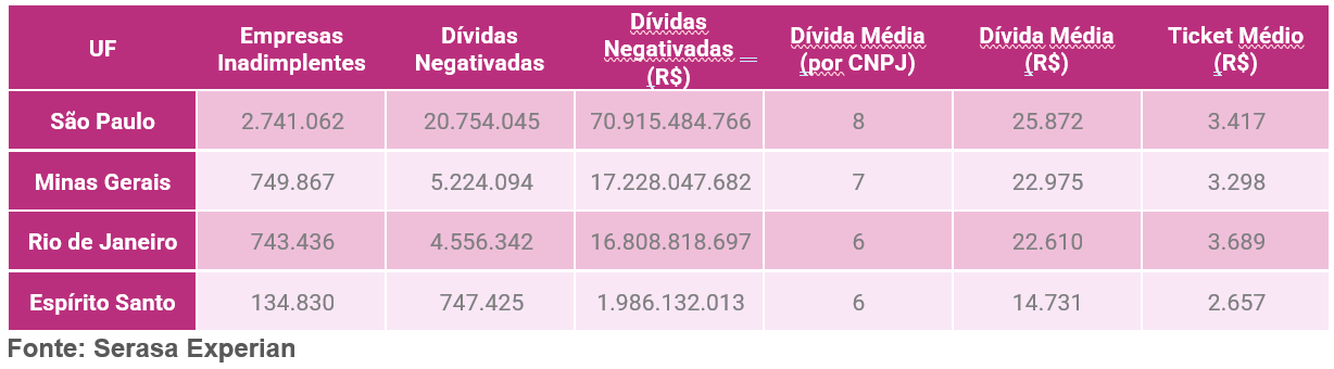 O Sudeste do país registrou mais de 4,3 milhões de empresas inadimplentes em agosto, a maior concentração regional das dívidas das empresas no Brasil. São Paulo se destacou com 2.741.062 companhias no vermelho, seguido por Minas Gerais, com 749.867 em números absolutos de CNPJs. O Rio de Janeiro somou 743.436 empresas negativadas, enquanto o Espírito Santo contou 134.830. Veja na tabela a seguir o detalhamento por Unidades Federativas (UFs) da região: