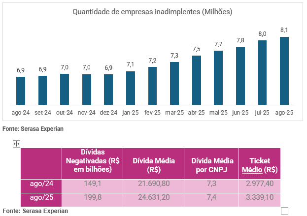 O avanço da inadimplência entre as empresas brasileiras vai além do recorde de 8,1 milhões de CNPJs negativados em agosto – o maior número desde o início da série histórica do Indicador de Inadimplência das Empresas da Serasa Experian, primeira e maior datatech do país. O impacto também se reflete nas finanças dessas companhias: no período, a dívida média totalizou R$ 24.631,20, um aumento de 13,6% em relação a agosto de 2024. Cada empresa inadimplente acumula, em média, 7,4 contas em atraso, com um ticket médio por compromisso financeiro vencido de R$ 3.339,10.