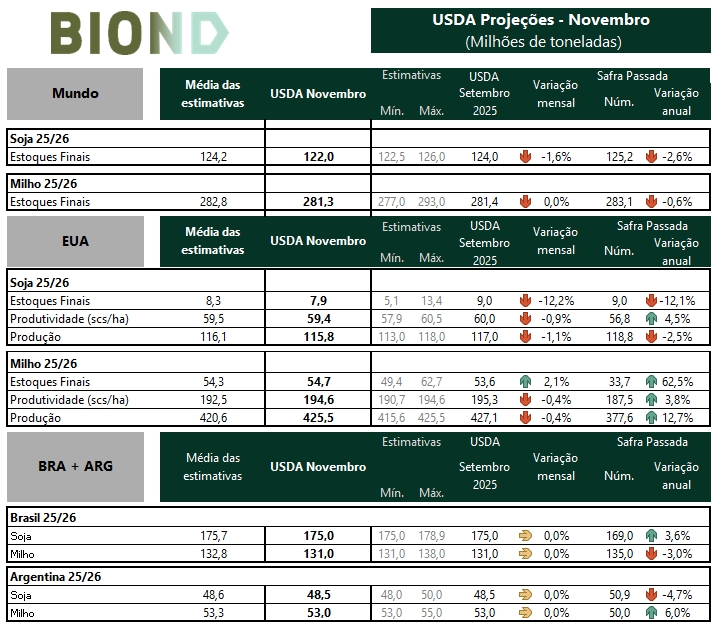 Há ainda a expectativa em torno dos próximos relatórios do USDA (Departamento de Agricultura dos EUA), que voltaram a ser publicados após semanas de paralisação. Se houver revisão moderada para baixo na produtividade americana ou sinalização de exportações mais firmes, Chicago pode responder com valorizações pontuais, aliviando a pressão global.